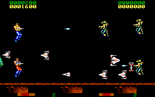 PrésentationForgotten Worlds est un jeu d'arcade réalisé et édité par Capcom en 1988. La compagnie japonaise était alors auréolée du succès de Commando, Ghosts 'n Goblins et Street Fighter (pour ne citer qu'eux), et Forgotten Worlds était en quelque sorte sa réponse à R-Type : un shoot 'em up horizontal nerveux, sur neuf niveaux d'un univers post-apocalyptique aux ambiances égyptiennes, et dont la principale originalité est de proposer de contrôler, non pas des vaisseaux spatiaux, mais des bodybuilders américains à lunettes noires équipés de jetpacks qui peuvent tirer dans les huit directions, indépendamment de leurs déplacements, à l'aide d'une deuxième molette. Les ennemis détruits laissent derrière eux des bulles que l'on peut échanger dans les boutiques contre l'équipement et des vies supplémentaires.