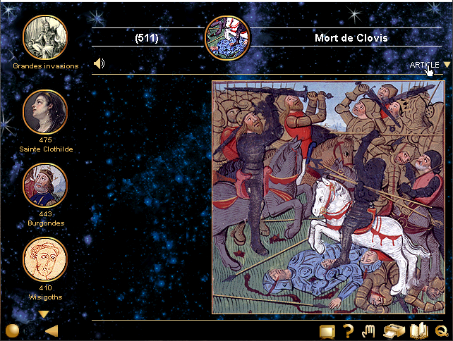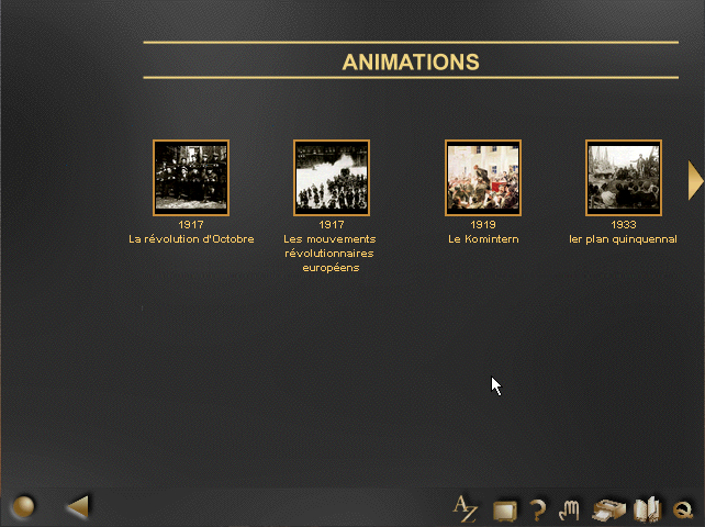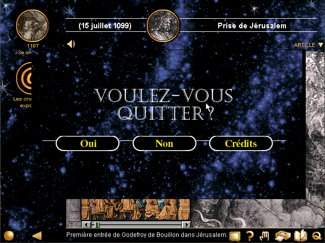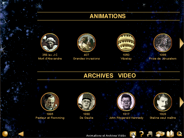 En outre, vous disposerez au bas de l'écran de quelques commandes utiles (survolez-les avec la souris pour connaître leur fonction), dont à gauche le bouton qui ouvre le menu et à droite le bouton qui permet de quitter le programme (avec la possibilité de voir les crédits). Je vous signale qu'une commande vous permettra d'accéder à des animations et à des vidéos, n'hésitez pas à vous en servir, c'est très bien fait.