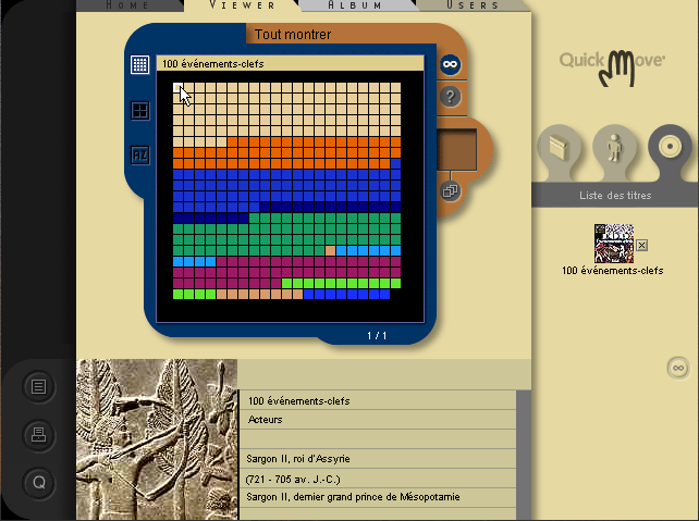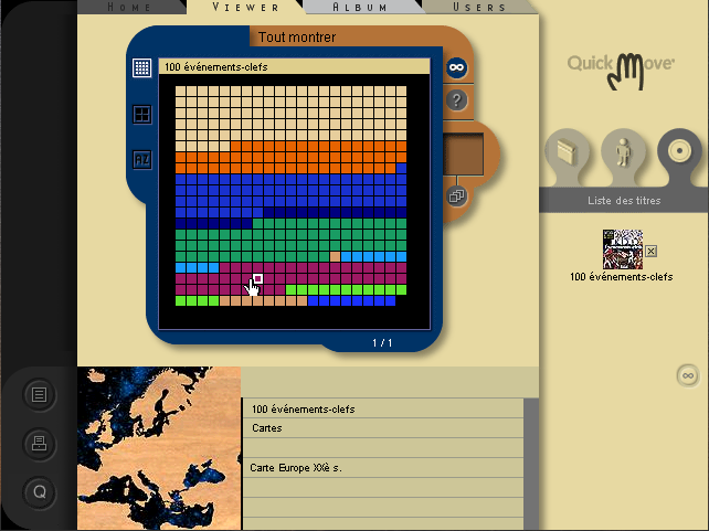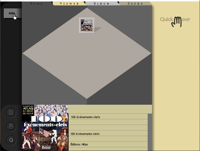 Mais ce n'est pas tout. Dès la première installation, un programme annexe appelé Quick Move sera également mis en place. Accessible depuis le bas de l'écran du programme principal (une main dressée) ou directement depuis le menu Démarrer de votre ordinateur, il regroupe les CD que vous avez installés, vous permet de découvrir leur contenu ou de naviguer dans celui qui est dans le lecteur (eh oui, ces programmes, même installés, ont besoin en permanence de leur CD). Cette navigation se fait selon les mêmes principes que la navigation principale, mais la présentation est très différente et c'est bien agréable d'avoir le choix, d'autant plus qu'on y trouve quelque gadgets supplémentaires : ainsi, la possibilité de contrôler ce que vous avez déjà vu et ce qui vous reste à voir.