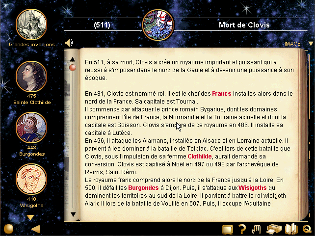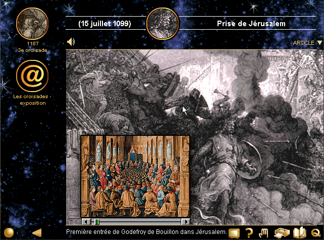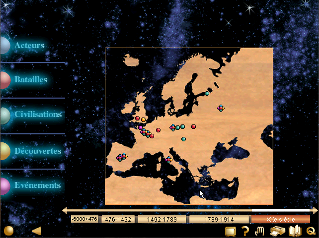 Naviguer ?J'ai trouvé que la navigation était vraiment intuitive dans ces programmes, avec la possibilité de se déplacer selon trois critères, en fonction du lieu (des cartes avec des repères qui vous ouvrent l'article demandé), en fonction de la période (des événements vous sont proposés le long d'une échelle de temps) ou à l'aide d'une recherche multicritère (par mot-clef, par date, lieu ou thème).