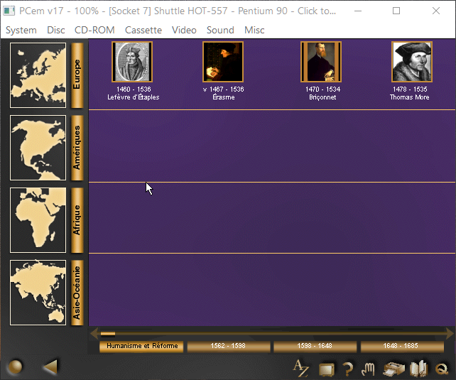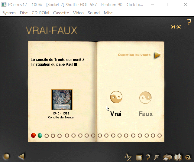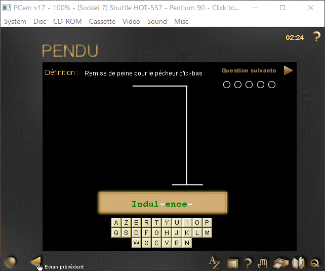 Et pour l'émulateur ? Si vous n'en avez pas encore installé un, regardez ce lien. Chez moi, tout s'est très bien passé avec PCem + Windows 95 (option Pentium75). Par contre, avec Windows 98, j'ai eu droit à des problèmes de son et de lenteur. Tout s'est également bien passé sous Windows 2000 et sous XP (32 bits) installés dans VirtualBox. Et d'autres formules sont encore possibles.