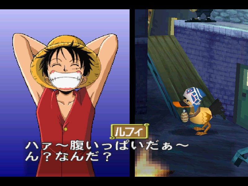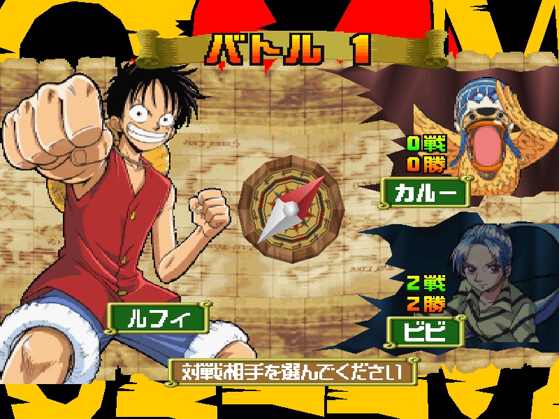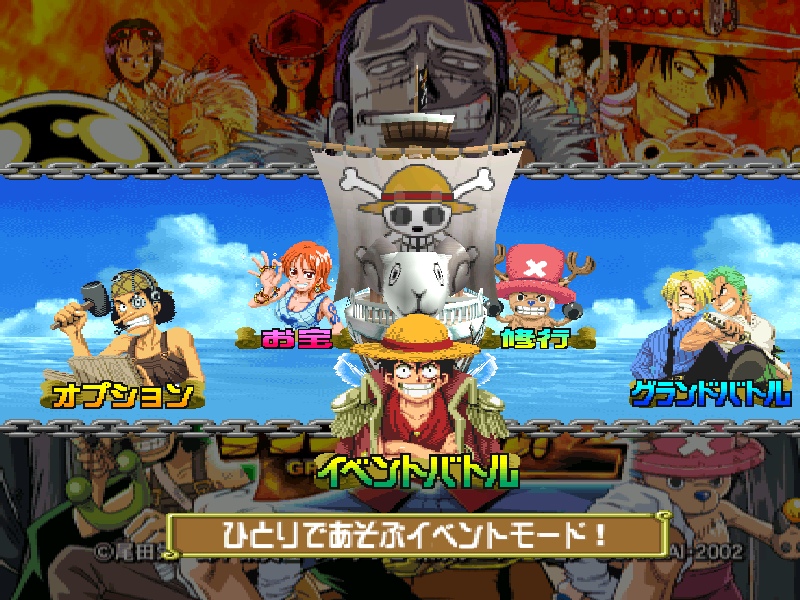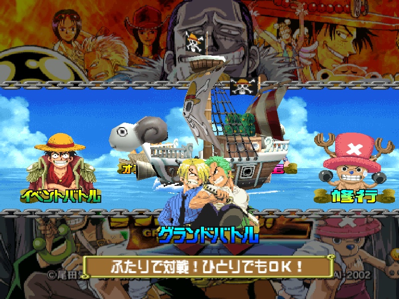 IntroductionOne Piece Grand Battle 2 est un jeu de combat en 1 vs 1 sorti en 2002 sur la première Playstation, et ensuite porté sur PC (uniquement en Corée). Comme son nom l’indique, il est adapté du célèbre manga One Piece de Eichiro Oda, plus précisément l’arc narratif en cours à l’époque dans le manga, la Saga Alabasta, couvert des tomes 12 à 24 du manga dans l’édition française. Le jeu est d’ailleurs sorti la même année que la conclusion de l’arc dans le manga, en 2002, avec à l’édition Namco-Bandai qui possède les droits d’adaptation de nombreux manga du magazine Weekly Shonen Jump, notamment One Piece, Dragon Ball ou Naruto. Au développement on retrouve le studio japonais Ganbarion, habitué des jeux vidéo adaptés de mangas encore aujourd’hui, à qui on doit énormément de jeux One Piece, mais aussi quelques jeux estampillés Dragon Ball.