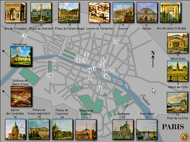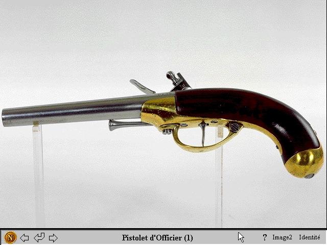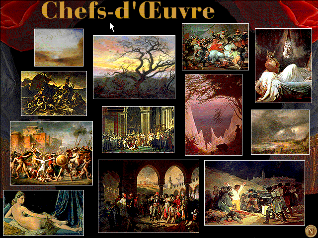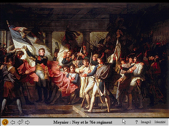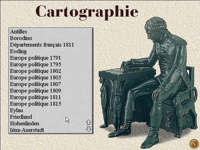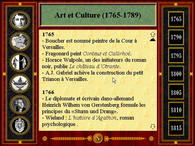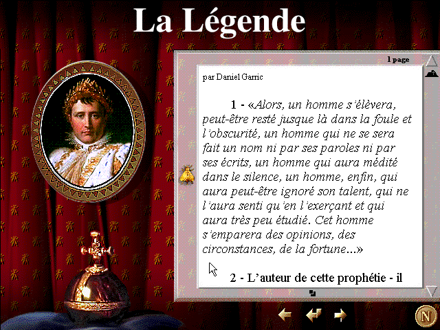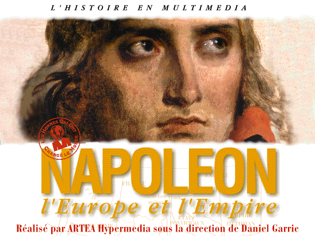 Napoléon, l'Europe et l'Empire est le deuxième CD-ROM conçu par le journaliste Daniel Garric. Il a été édité par Infogrames - sans doute Bruno Bonnell avait-il une affection pour Napoléon, lui qui lancera aussi sa propre grande campagne de rachats de sociétés étrangères sans se préoccuper de la viabilité du projet à long terme, avec des conséquences comparables, quoique moins sanglantes. Le CD-ROM est découpé en plusieurs parties, accessibles par le menu affiché lorsque l'on clique sur le médaillon "N" affiché en bas de l'écran. "Faits" est une frise chronologique détaillant aussi bien la vie de Napoléon que les évènements politiques, militaires, scientifiques et culturels contemporains. "Paris" est une simple carte d'époque avec quelques illustrations, "Cartes" propose une série de cartes d'Europe ou de certains lieux. "Peintures", "Chefs d'oeuvre", "Documents" et "Armée" contiennent des dizaines de peintures, de photos et d'autres documents. Le problème ici est que ces éléments sont simplement classés par ordre alphabétique, que leur rangement dans une section ou une autre n'est pas toujours clair, et qu'il y a peu de liens entre eux. On passera donc l'essentiel du temps à les regarder les uns après les autres, ou à les chercher dans l'index.