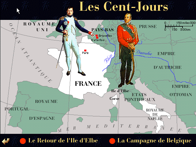 Ce texte prémonitoire de Jacques de Guibert ouvre ce CD-ROM à la gloire de Napoléon - une manière polie d'affirmer que parmi tous les individus arrivistes et/ou convaincus de leur propre grandeur, il y en aura bien un qui ira plus loin que les autres. Tel fut le "destin" de Napoléon Bonaparte, général corse qui, à force de manigances et de victoires militaires, va parvenir à se saisir du pouvoir suprême, et, loin de se contenter de la gestion du pays (cf le code civil qui harmonise les administrations nationales), ne ratera pas la moindre occasion d'agrandir son empire. Plans d'invasion de l'Angleterre stoppés net par la défaite de Trafalgar (1805), blocus continental à cause duquel il se met plusieurs régions à dos, renversement de régimes sans se préoccuper de la stabilité politique et de l'assentiment de la population (guerre d'Espagne en 1808), et pour finir une tentative de speedrun de la conquête d'Europe en attaquant la Russie, sans même sécuriser les territoires intermédiaires ou préparer d'éventuels renforts. La campagne de Russie est un échec, suivi d'une retraite précipitée en sens inverse, en plein hiver, à travers des territoires hostiles, qui décime l'armée française. L'abdication de 1814 et le séjour à l'île d'Elbe auraient dû encourager Napoléon à passer à autre chose, mais comme les politiciens qui tentent un comeback après une raclée (à la façon "j'ai changé, j'ai écouté les Français"), il revient au pouvoir en 1815, au grand déplaisir des pays voisins qui reprennent l'offensive. On connait la suite : la défaite humiliante de Waterloo (dont les Anglais se régalent depuis des siècles), suivie par la deuxième abdication de Napoléon et son exil à Saint-Hélène, laissant derrière lui un pays en piteux état. Et pourtant, des siècles plus tard, il continue de fasciner bon nombre de politiciens obsédés par leurs rêves de grandeur et leurs fantasmes de l'Homme providentiel arrivé de rien ou presque et qui rassemble un pays déchiré sous son nom - et en s'octroyant le pouvoir à vie, si possible.