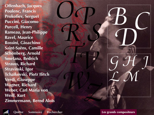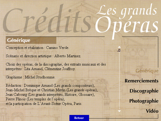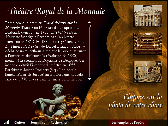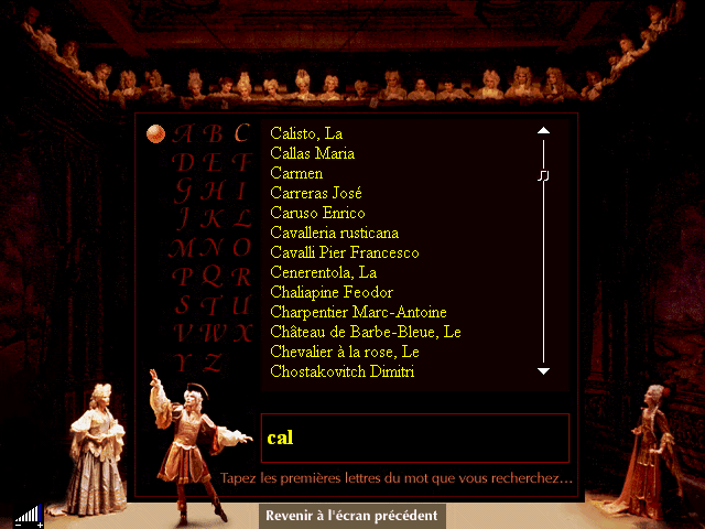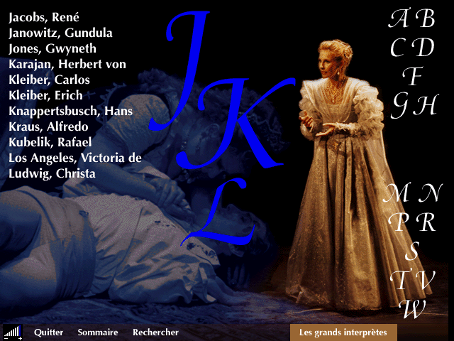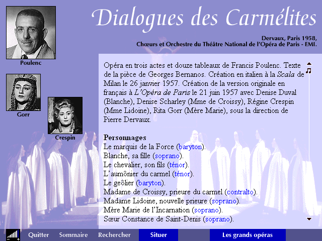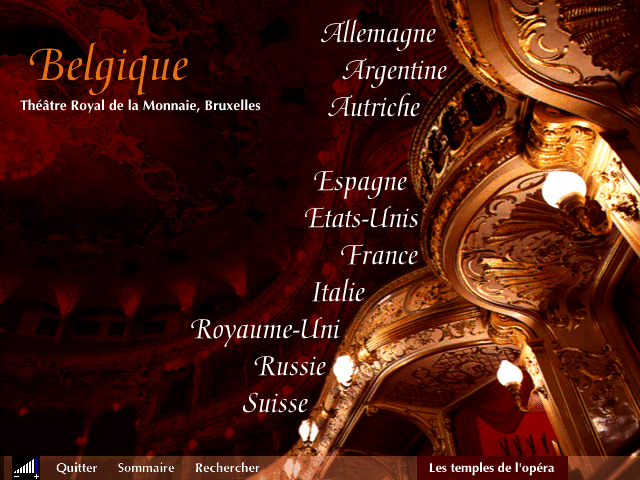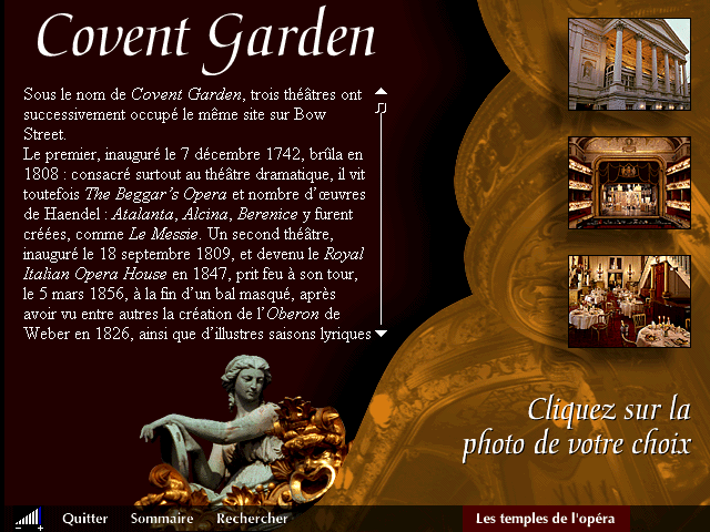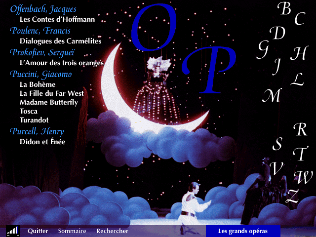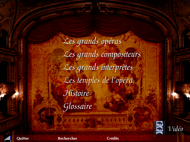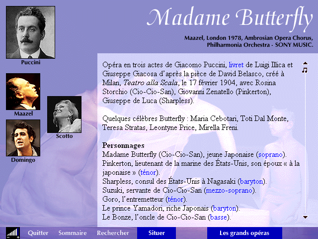 PrésentationContrairement à la peinture, on trouve relativement peu de logiciels consacrés à la musique, et encore moins à l'opéra. Hé bien, en voici un, et pas n'importe lequel : celui-ci se propose tout simplement de nous faire découvrir l'univers de l'opéra !