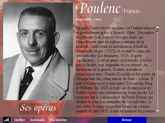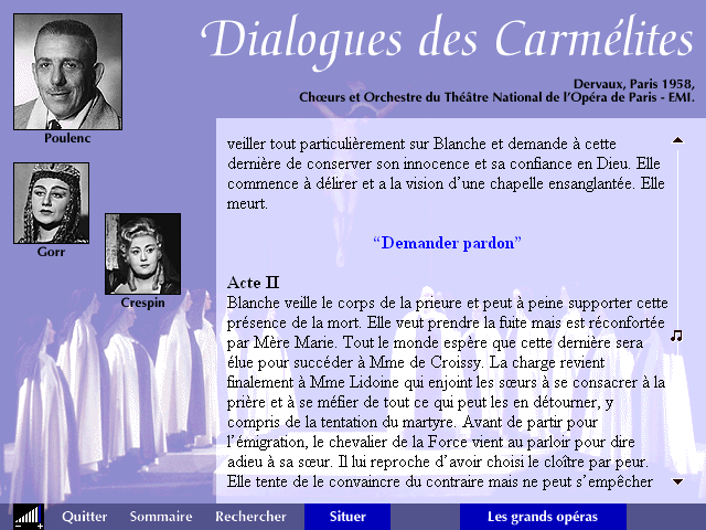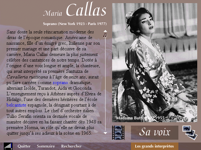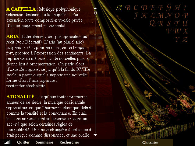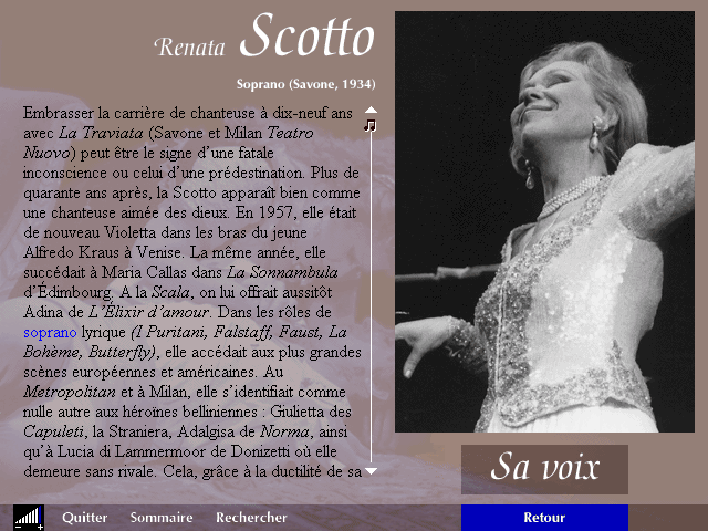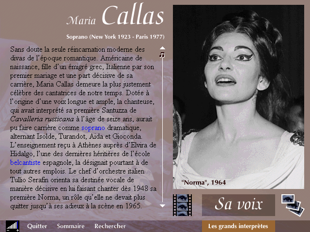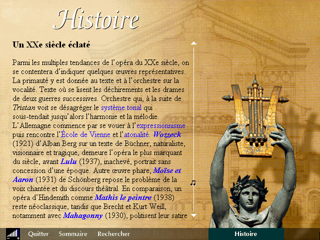 Les textes de présentation sont très bien faits et intéressants, les extraits sont bien choisis et agréables à écouter, les illustrations sont belles. En outre, le contenu de ce CD est très riche. D'abord, c'est une centaine d'opéras qui nous sont présentés, sans compter les compositeurs et les interprètes qui ont marqué leur temps. Ensuite, les extraits (oui, courts) sont accompagnés de la partition (enfin, pour la partie que vous entendrez), et dans chaque texte, des mots mis en évidence vous permettent d'entendre ou de lire une explication de qualité, sans compter le glossaire, tout simplement passionnant quand on aime la musique mais qu'on n'en a pas fait sa spécialité. Ainsi par exemple, vous pourrez apprendre ou redécouvrir ce qu'est une cavatine, avec illustration sonore, ou un castrat. Enfin, une rubrique historique, parfois succincte mais très bien faite elle aussi, permet de replacer toutes ces œuvres et ces personnes dans leur contexte. Elle est complétée par un bouton Situer qui apparaît quand on consulte la page d'un opéra ; il permet de découvrir, sous forme de liste, les œuvres "contemporaines" de l'opéra en question. Sur ce dernier point, j'exprimerai quand même un petit regret, il est dommage que les éléments historiques ne soient pas présentés de façon plus graphique.