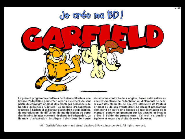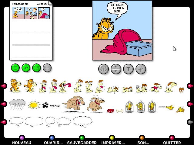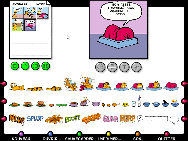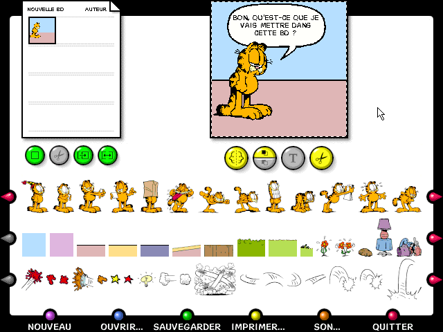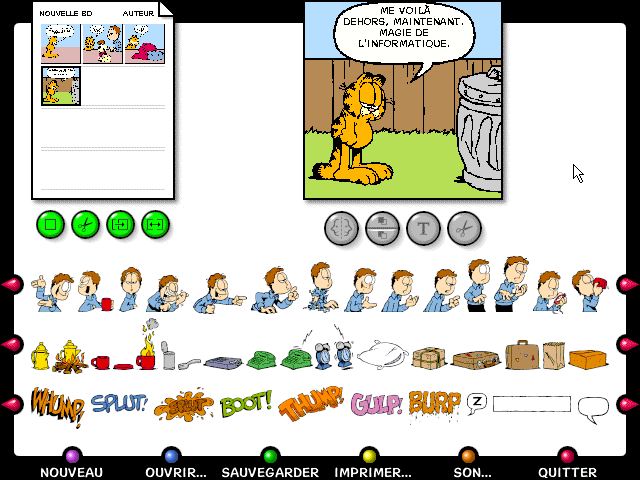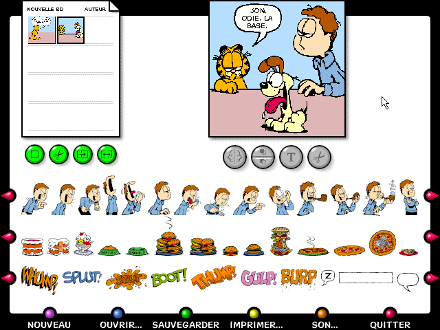 PrésentationDepuis sa création par Jim Davis et sa première parution dans la presse le 19 juin 1978, le chat Garfield est devenu un des personnages de BD américaine les plus connus dans le monde, et l'un des plus lucratifs tant que les produits dérivés abondent - l'année même de ses débuts, un jeu de cartes et un jeu de société sont sortis ! Il y en avait partout dans les boutiques de gadget à la fin des années 80, avant que les Simpsons ne débarquent pour réclamer leur part du gâteau. La longévité et le manque de renouvellement de la série ont parfois suscité des quolibets et des détournements, comme l'oulipien Garfield Minus Garfield. Grâce à cet énième outil de création de BD de Lascaux, utilisant la même interface que les précédents, vous allez pouvoir montrer si vous êtes meilleur que Jim Davis. Sans surprise, la majorité des images proposées représentent Garfield, Jon et Odie. Liz la vétérinaire et le père de Jon n'ont droit qu'à cinq images, et Lyman a disparu depuis belle lurette. Sacrilège, je n'ai pas vu d'image de lasagnes, sauf une en train d'être dévorée ! Pour le reste, le format des gags en trois images est respecté, et il n'est toujours pas possible de lire ses propres comics sans les imprimer.