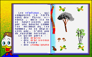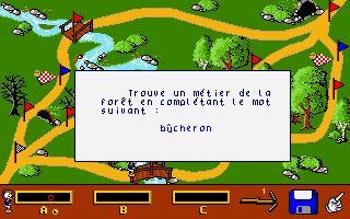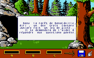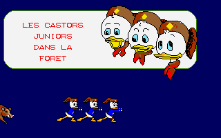 Salut mes petits castors !Riri, fifi et Loulou sont des personnages mis en valeur depuis les années 30 dans la galaxie Disney. Ils représentent tour à tour les bourreaux de Donald (leur oncle) puis des garnements amateurs de bêtises en tout genre. Ils changent de registre dans la Bande à Picsou où ils mènent des enquêtes sur des trésors anciens avec leur Oncle Donald et Picsou. D'allure plus respectable, ils auront en France leur petit succès avec une diffusion Prime Time. Un an après leurs premières aventures sur le petit écran, les voilà en format vidéo-ludique. A la différence des jeux ultérieurs, où Disney tiendra à créer lui-même le contenu, ce logiciel a été sous-traité. En l’occurrence au duo Cockel Vision pour la création et le développement et de Nathan. Voilà qui nous place d'emblée dans un jeu éducatif à destination des 6 ans et plus. Vous pouvez jouer jusqu'à trois joueurs consécutivement : vous incarnerez Riri ou Fifi, ou Loulou. Votre objectif est de suivre un chemin balisé. Vous avancez, vous devez donner de bonnes réponses aux questions qui vous sont posées. Nom du jeu oblige (les castors juniors dans la forêt), les questions sont liées au milieu sylvain. Sur une planche unique, vous devez faire preuve de logique et de connaissances pour fournir la bonne réponse. Une fois que vous progressez, vous devez compléter la boucle de randonnée proposée. Techniquement, le logiciel est dans une très haute moyenne avec des graphismes de toute beauté pour l'époque. On se plait à continuer un petit peu pour voir d'autres images. Le son, comme souvent, ne constitue pas le point fort du titre à l'image de tant d'autres logiciels des années 80. Plaisant sur la forme (je pense aux graphismes colorés et reprenant bien le design de Disney) mais limité dans le fond (le jeu tourne vite à un ensemble de questions-réponses statique), il est à réserver aux fans des Castors Juniors.