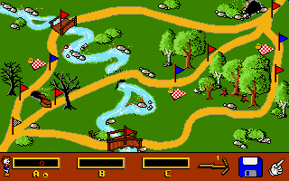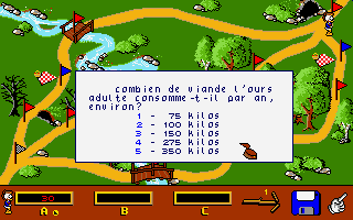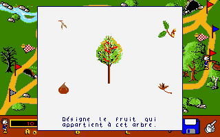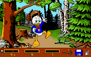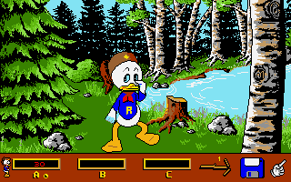 Riri, fifi et Loulou sont des personnages mis en valeur depuis les années 30 dans la galaxie Disney. Ils représentent tour à tour les bourreaux de Donald (leur oncle) puis des garnements amateurs de bêtises en tout genre. Ils changent de registre dans la Bande à Picsou où ils mènent des enquêtes sur des trésors anciens avec leur Oncle Donald et Picsou. D'allure plus respectable, ils auront en France leur petit succès avec une diffusion Prime Time. Un an après leurs premières aventures sur le petit écran, les voilà en format vidéo-ludique. A la différence des jeux ultérieurs, où Disney tiendra à créer lui-même le contenu, ce logiciel a été sous-traité. En l’occurrence au duo Cockel Vision pour la création et le développement et de Nathan. Voilà qui nous place d'emblée dans un jeu éducatif à destination des 6 ans et plus. Vous pouvez jouer jusqu'à trois joueurs consécutivement : vous incarnerez Riri ou Fifi, ou Loulou. Votre objectif est de suivre un chemin balisé. Vous avancez, vous devez donner de bonnes réponses aux questions qui vous sont posées. Nom du jeu oblige (les castors juniors dans la forêt), les questions sont liées au milieu sylvain. Sur une planche unique, vous devez faire preuve de logique et de connaissances pour fournir la bonne réponse. Une fois que vous progressez, vous devez compléter la boucle de randonnée proposée. Techniquement, le logiciel est dans une très haute moyenne avec des graphismes de toute beauté pour l'époque. On se plait à continuer un petit peu pour voir d'autres images. Le son, comme souvent, ne constitue pas le point fort du titre à l'image de tant d'autres logiciels des années 80. Plaisant sur la forme (je pense aux graphismes colorés et reprenant bien le design de Disney) mais limité dans le fond (le jeu tourne vite à un ensemble de questions-réponses statique), il est à réserver aux fans des Castors Juniors.