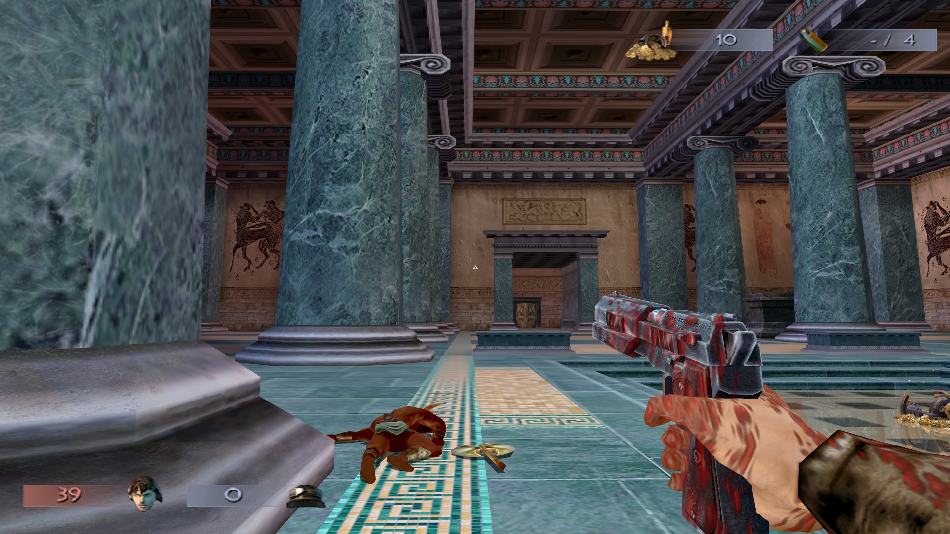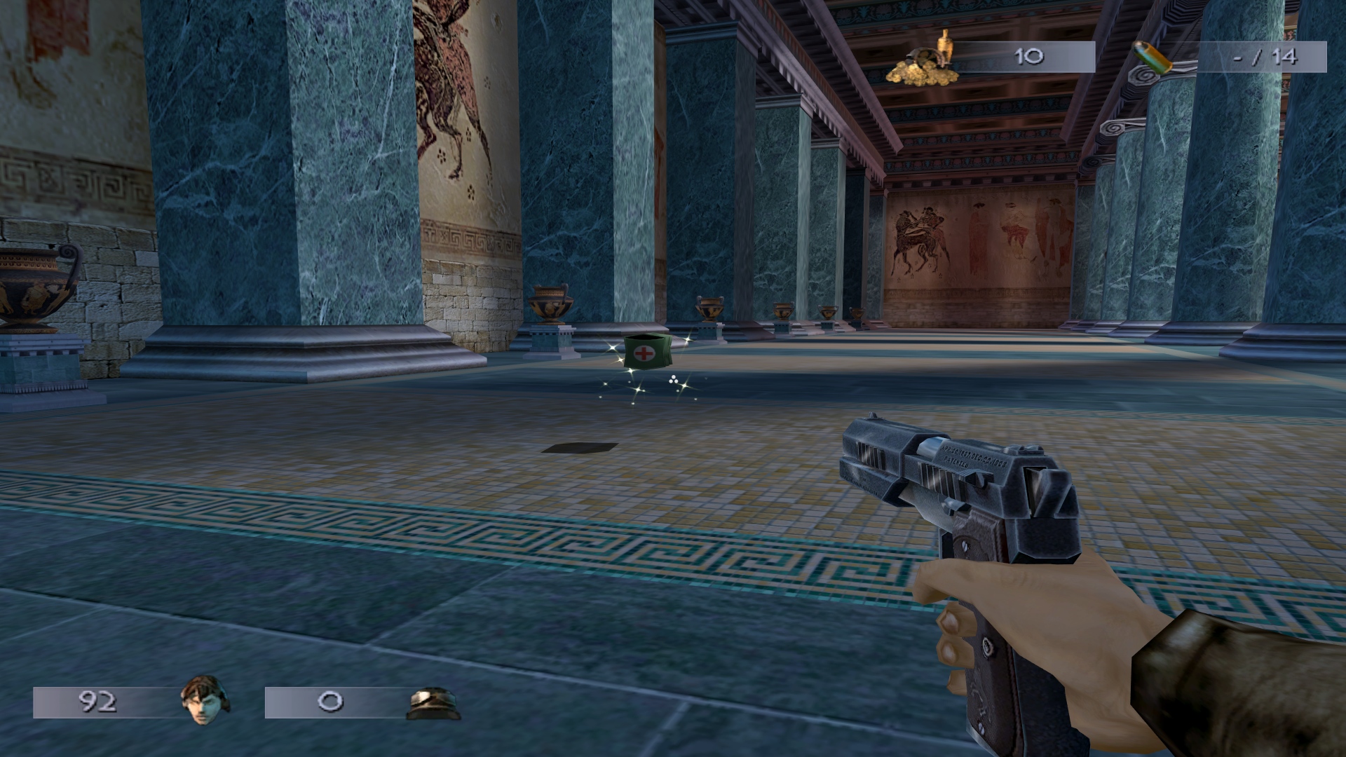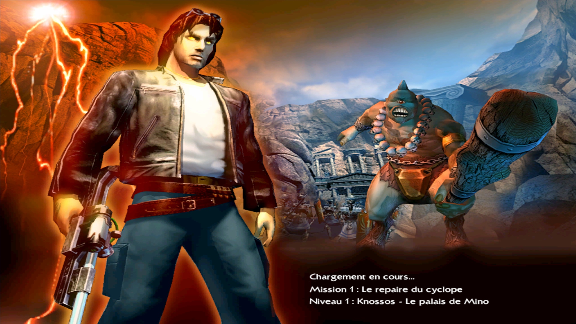 Will Rock nous raconte l’histoire de… Bah Will Rock, sorte de cliché sur pattes du fan de Hard Rock européen avec ses cheveux longs et sa dégaine typique des années 2000 qui se retrouve en Grèce dans une cinématique d’introduction au format bande-dessinée dont le style semble tout droit sorti d’un vieux numéro du magazine Métal Hurlant. Et je vais pour l’occasion paraphraser John Carmack lorsqu’il parlait du scénario des jeux Doom : “L’histoire dans un jeu vidéo, c’est comme l’histoire dans un film pour adultes : on s’attend à ce qu’elle soit là, mais c’est pas si important”. Et il semblerait que les développeurs de Saber Interactive ont pris cette remarque à la lettre tant le scénario de Will Rock est un parangon de second degré et de scénario “Timbre-poste” : Des cultistes du panthéon grec antique kidnappent une jolie demoiselle dont est amoureux le héros, qui se retrouve investi du pouvoir quasi divin du gardien Prométhée et qui va donc devoir se frayer un chemin au travers d’une dizaine de niveaux en utilisant un arsenal extrêmement bateau, en dehors d’un Rayon Médusa servant à pétrifier les ennemis.