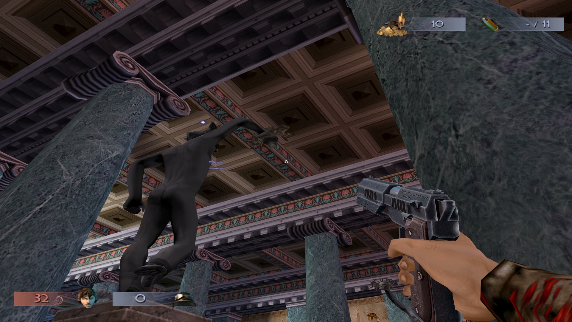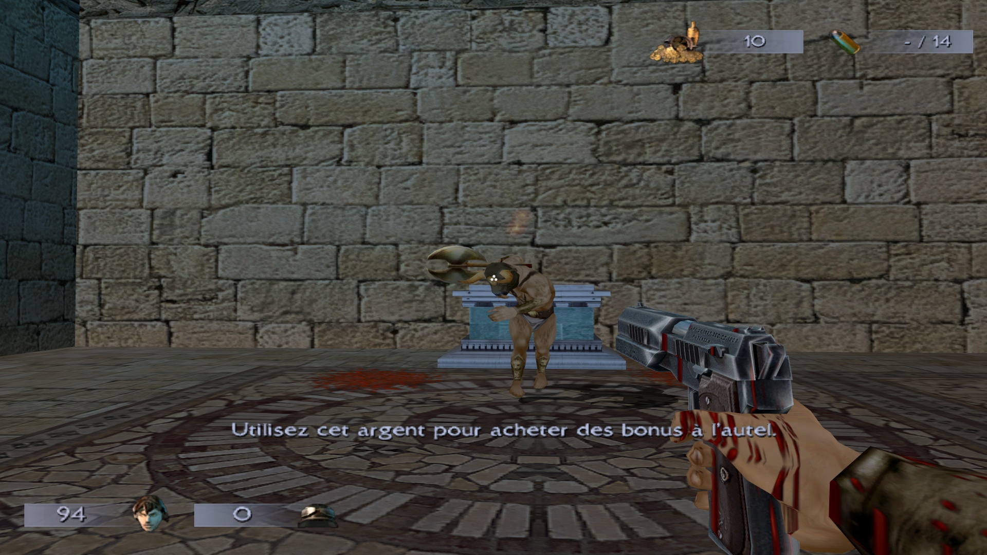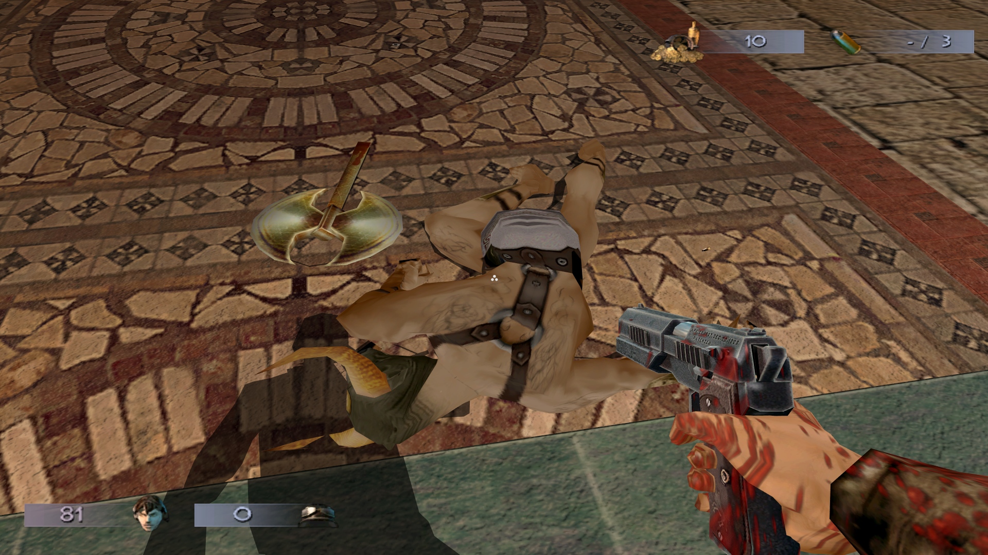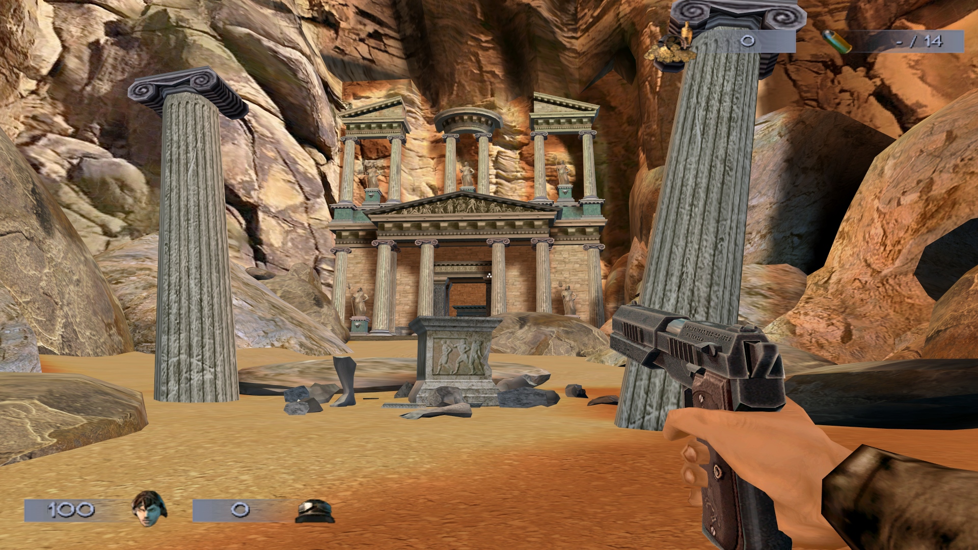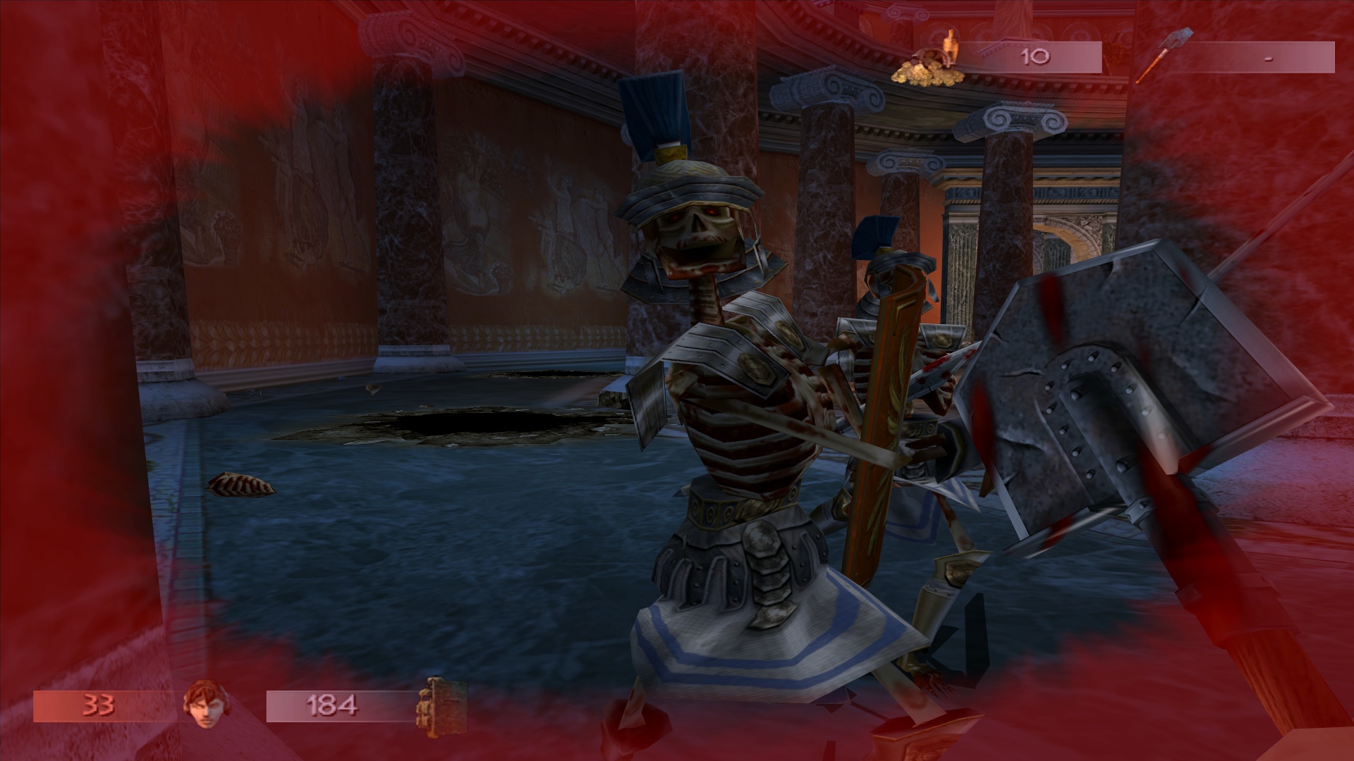 On va tout de suite crever l’abcès : Will Rock est une tentative un peu pathétique de surfer sur la grosse popularité de Serious Sam, monument du FPS frénétique sorti en 2001 et ayant eu un impact assez important sur le genre du FPS de manière générale. Will Rock tente de reproduire à la fois l’humour et le gameplay du jeu de Croteam, sans pour autant posséder le budget et le talent nécessaires pour offrir une expérience aussi qualitative au joueur. Alors entendons nous bien, ce n’est pas catastrophique, mais les premiers niveaux du jeu où on se retrouve cantonné à un petit pistolet et une pelle sont particulièrement ennuyeux, et le manque de variété des ennemis n’aide pas. Et pourtant on sait que le contexte pseudo-mythologique fonctionne, Lobotomy Software ayant signé avec Exhumed (ou Powerslave outre Atlantique) un des meilleurs Doom-Like de son temps quelques années auparavant.