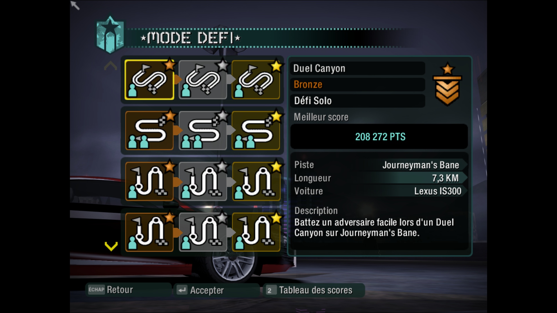 Au niveau de la structure de ses modes de jeux, Need for Speed Carbon est sensiblement plus court que son aîné, avec visiblement la volonté de s’affranchir des longueurs en réduisant considérablement le nombre de poursuites avec la police. Ainsi lors de ce test, il aura fallu environ 9h pour terminer la carrière à 100% (toutes les épreuves remportées) et 5h de plus pour boucler le mode challenge, le tout n’incorporant qu’une vingtaine de poursuites, contre bien plus d’une centaine dans Most Wanted. Un contenu réduit qui aura pu en frustrer certains, même si d’autres seront soulagés de ne pas de nouveau avoir à faire en boucle les mêmes épreuves pendant des dizaines d’heures.