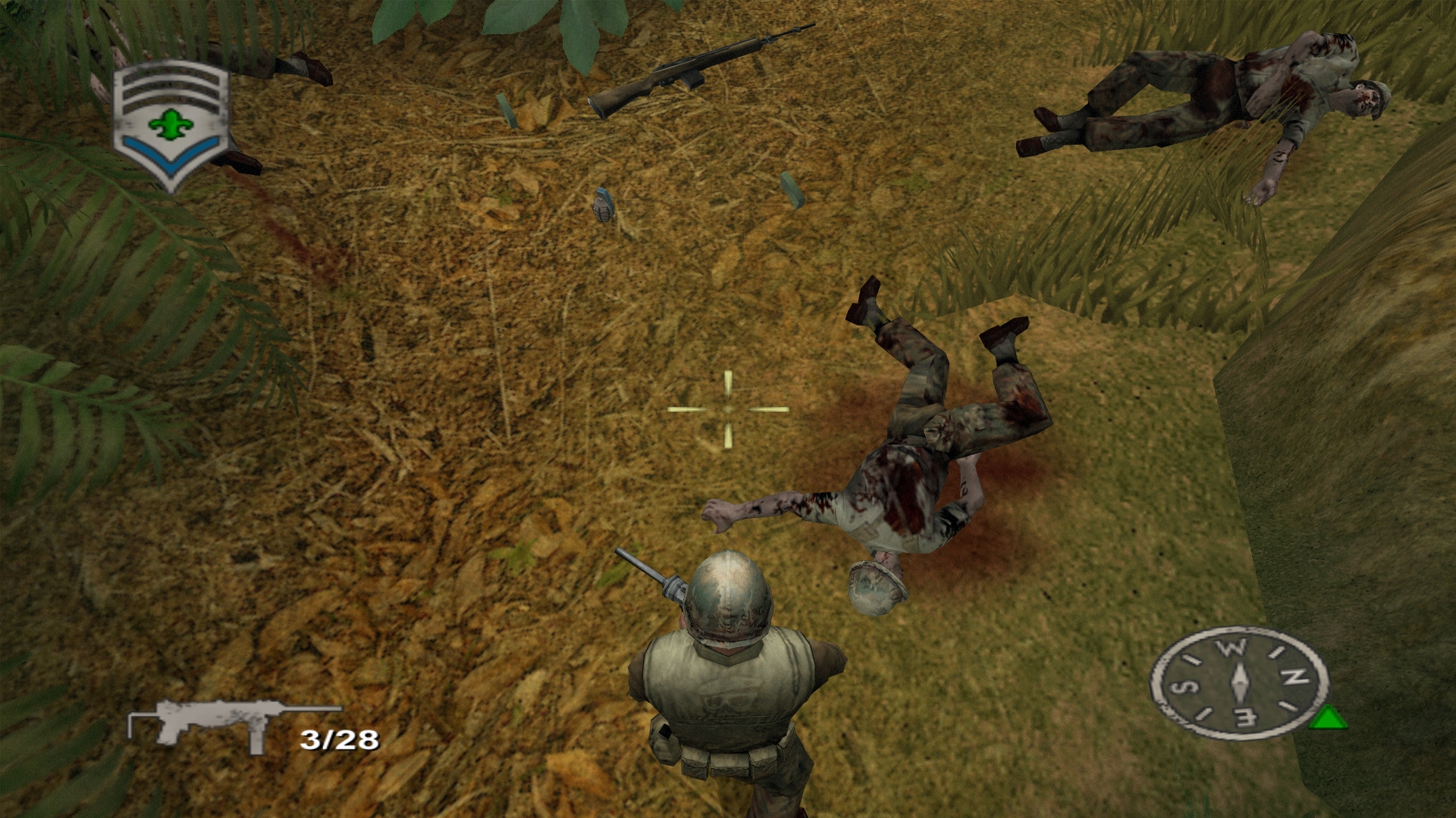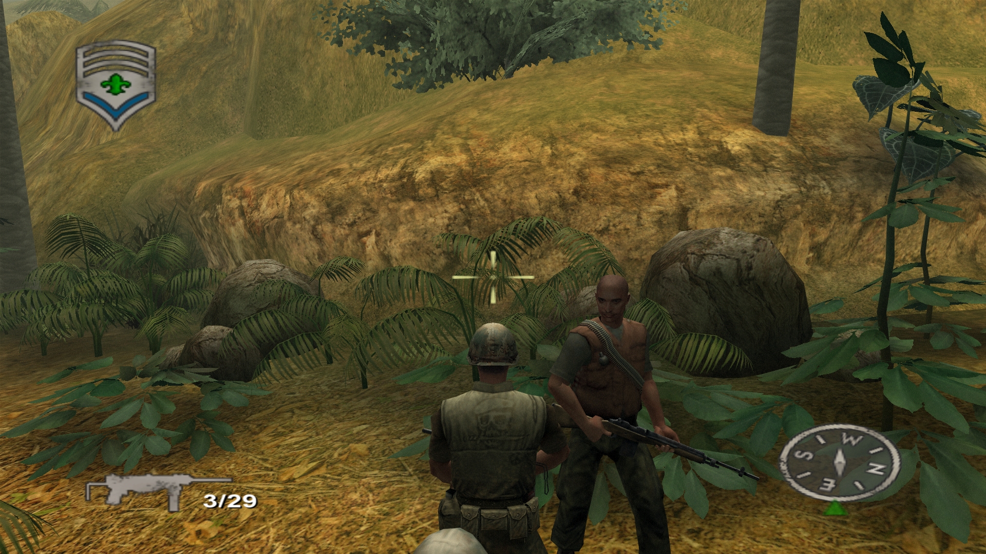 Parce que oui, pour un jeu qui est censé dépeindre les horreurs du conflit vietnamien, Shellshock : ‘Nam 67 se prend un peu les pieds dans le tapis, avec une mise en scène qui oscille entre le très bon sur certains passages et le risible sur d’autres. Certaines critiques de l’époque iront même jusqu’à dire du jeu qu’il rend la guerre du Vietnam glamour, ce qui irait totalement à l’encontre de l’intention de base des développeurs. A titre personnel je n’irais pas jusque là, Shellshock : ‘Nam 67 reste un jeu qui ne prend pas de pincettes et souhaite montrer des scènes crues au joueur, notamment des scènes de torture assez peu ragoutantes. On pourrait mettre le manque de qualité graphique du jeu sur son âge, mais en 2004, on avait déjà droit à des titres beaucoup plus aboutis graphiquement, même si le jeu s’en sort avec les honneurs sur ce point.