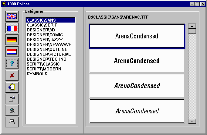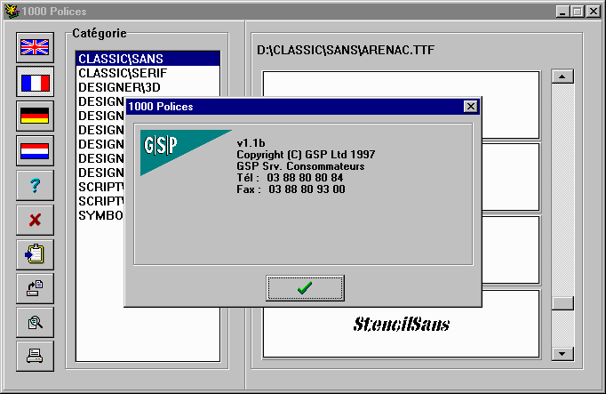 Avec ce logiciel, vous allez pouvoir augmenter votre choix typographique sous Windows de 1000 polices d'écritures supplémentaires. La visionneuse est commune aux logiciels GSP comme 500 sons ou 1500 photos en quatre langues: français, anglais, allemand et néerlandais. Mais au final, vous savez au fond de vous que vous finirez toujours pas utiliser Courier New, Comic Sans MS ou Time New Roman.