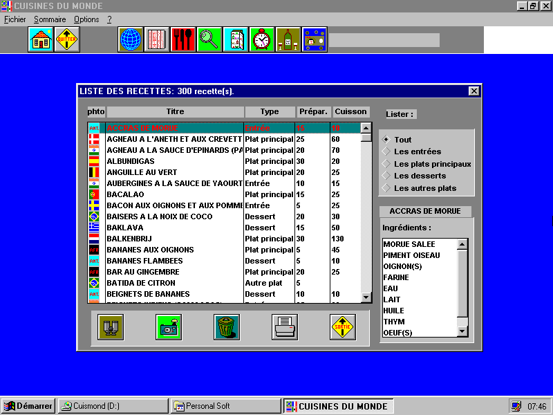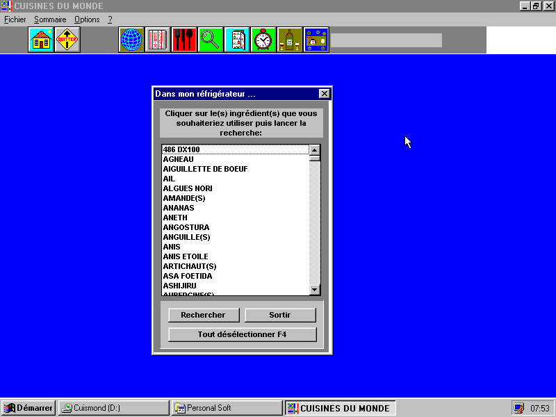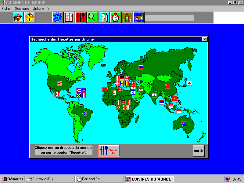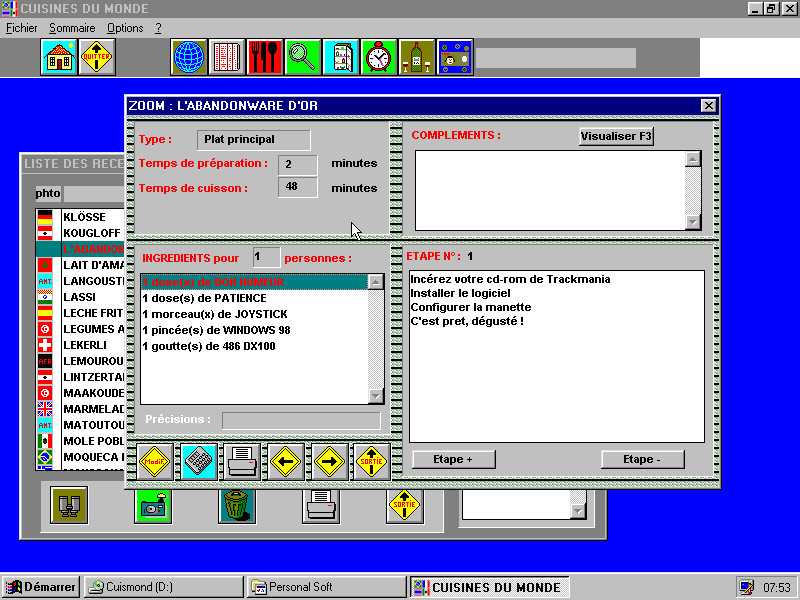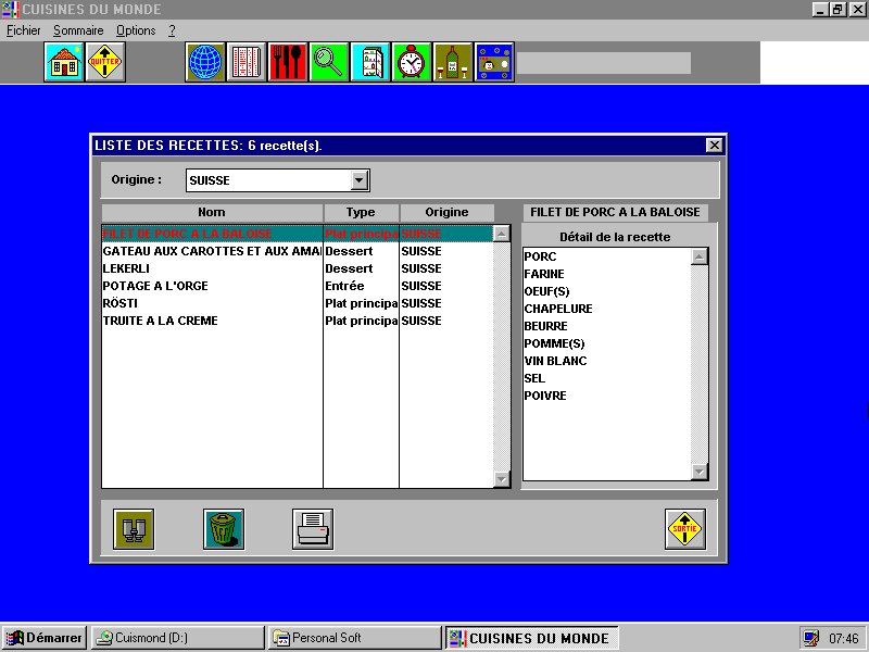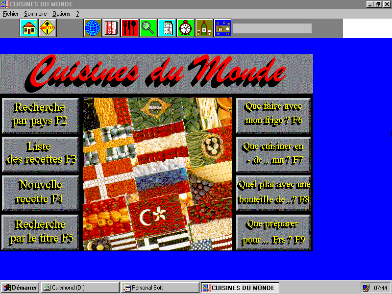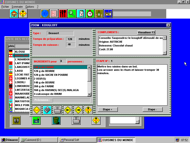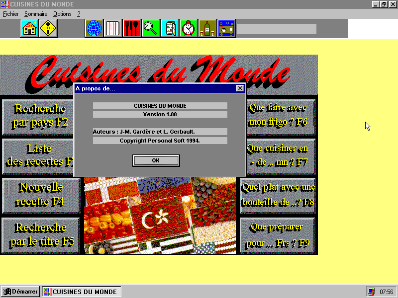 Un logiciel de recettes en 1994, voilà une idée qui était intéressante. Nous sommes encore sous Windows 3.1 et cela devait être révolutionnaire pour l'époque. Il était possible de choisir une recette par pays ou région sur une carte du monde, par le nom de la recette, par un ou des ingrédients, pour un montant limité (...en francs), par le choix d'une durée de préparation ou enfin, en accord avec un vin.