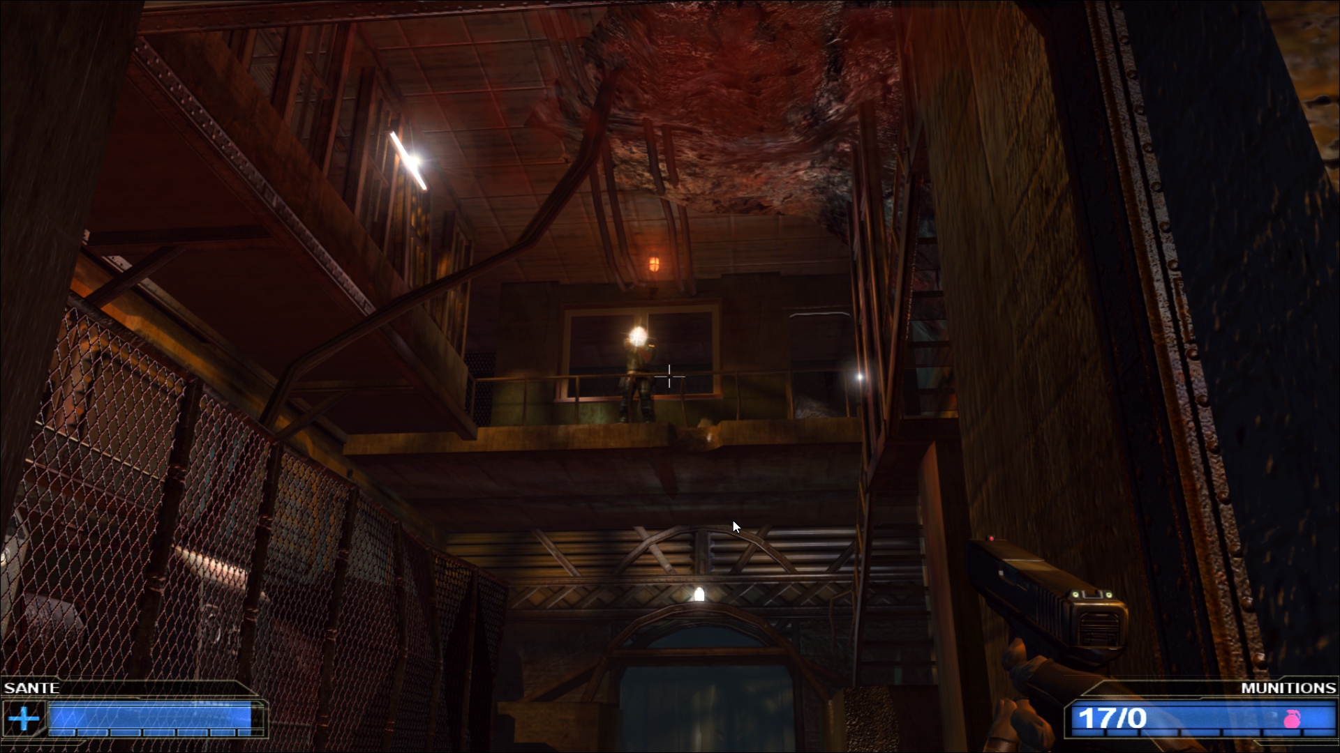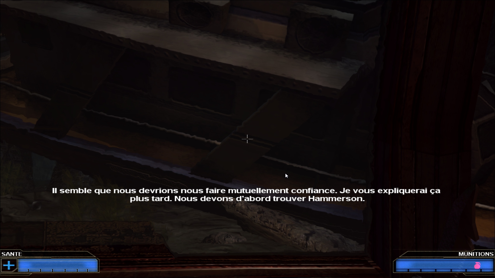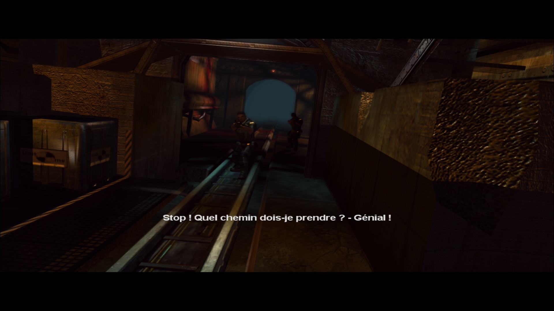 Derrière ce scénario que n’aurait pas renié Alerte Rouge, on trouve un titre qui semble être un mélange entre l’ambiance oppressante d’un Bioshock et la nervosité des jeux de tirs à la première personne frénétiques qui ont fait le bonheur de franchises comme Doom ou Quake. Une comparaison infiniment plus flatteuse que le résultat à l’écran, avec un moteur de jeu dépassé de plusieurs années et des graphismes qui ressemblent plutôt au premier Unreal qu’à… Bah Bioshock, typiquement, qui est sorti légèrement après ce Red Ocean. En même temps, les signes étaient déjà sur la jaquette : le jeu est distribué sur un CD, alors que la quasi intégralité des jeux PC de l’époque étaient passés sur le format DVD, permettant un stockage beaucoup plus important. Le fait que l’intégralité de Red Ocean tienne sur un petit CD explique à la fois ses graphismes mais aussi son aventure plutôt courte et très linéaire, où on se contente d’avancer et d’exploser tout ce qui se trouve sur notre chemin, avec des armes plus ou moins exotiques mais qui globalement ne vont pas vous faire voyager… Et il va falloir aussi mentionner la traduction française, avec un protagoniste particulièrement ordurier et qui ne ferait pas tâche dans un épisode de Grand Theft Auto tant la moitié de ses répliques sont des insultes.