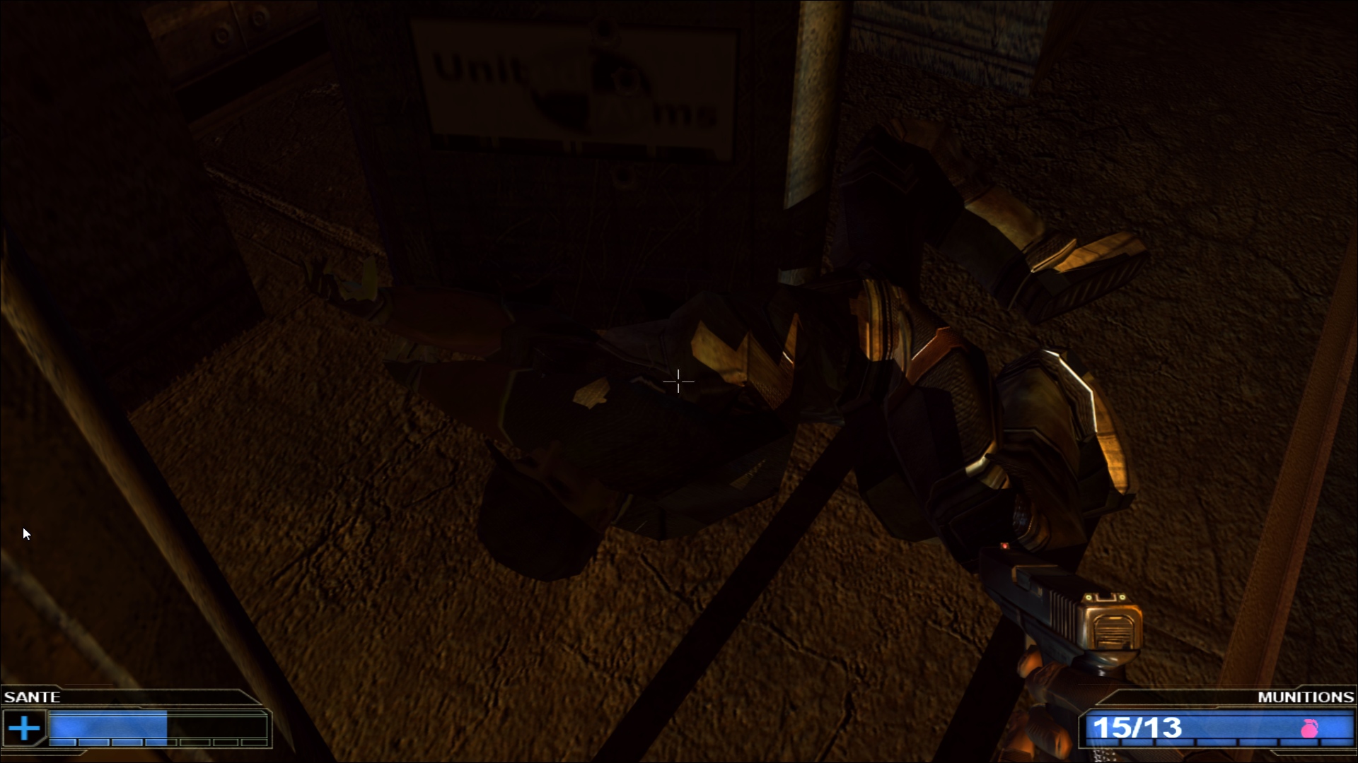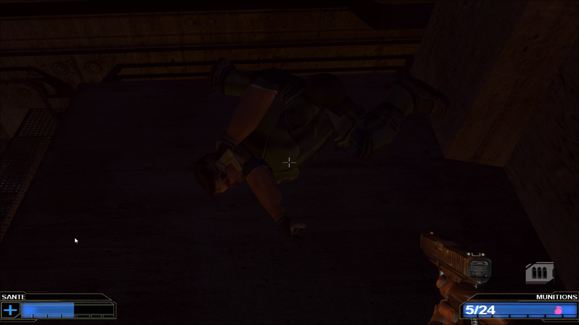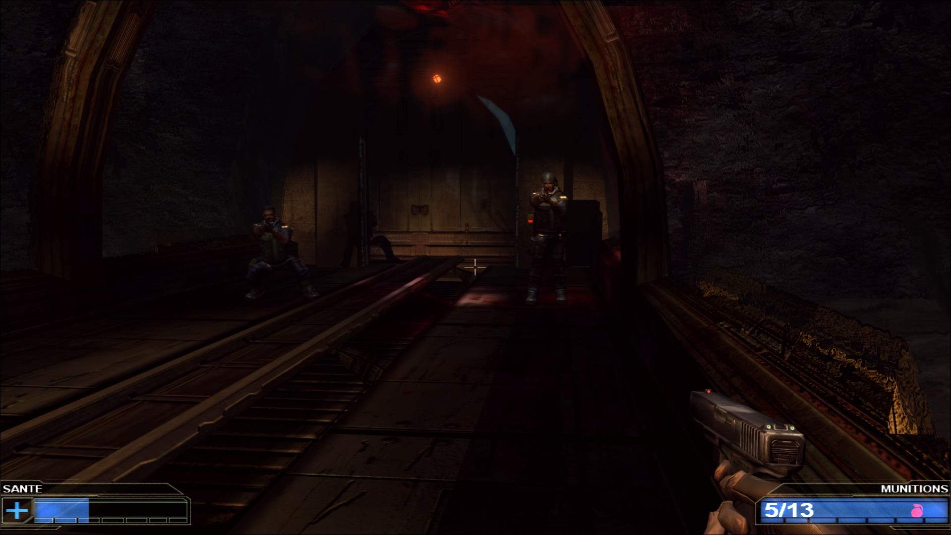 Derrière ce scénario que n’aurait pas renié Alerte Rouge, on trouve un titre qui semble être un mélange entre l’ambiance oppressante d’un Bioshock et la nervosité des jeux de tirs à la première personne frénétiques qui ont fait le bonheur de franchises comme Doom ou Quake. Une comparaison infiniment plus flatteuse que le résultat à l’écran, avec un moteur de jeu dépassé de plusieurs années et des graphismes qui ressemblent plutôt au premier Unreal qu’à… Bah Bioshock, typiquement, qui est sorti légèrement après ce Red Ocean. En même temps, les signes étaient déjà sur la jaquette : le jeu est distribué sur un CD, alors que la quasi intégralité des jeux PC de l’époque étaient passés sur le format DVD, permettant un stockage beaucoup plus important. Le fait que l’intégralité de Red Ocean tienne sur un petit CD explique à la fois ses graphismes mais aussi son aventure plutôt courte et très linéaire, où on se contente d’avancer et d’exploser tout ce qui se trouve sur notre chemin, avec des armes plus ou moins exotiques mais qui globalement ne vont pas vous faire voyager… Et il va falloir aussi mentionner la traduction française, avec un protagoniste particulièrement ordurier et qui ne ferait pas tâche dans un épisode de Grand Theft Auto tant la moitié de ses répliques sont des insultes.