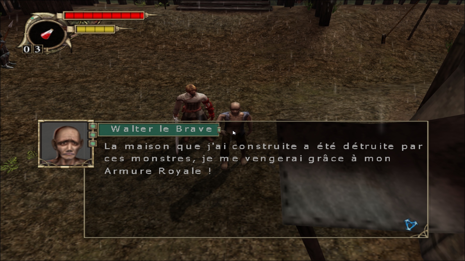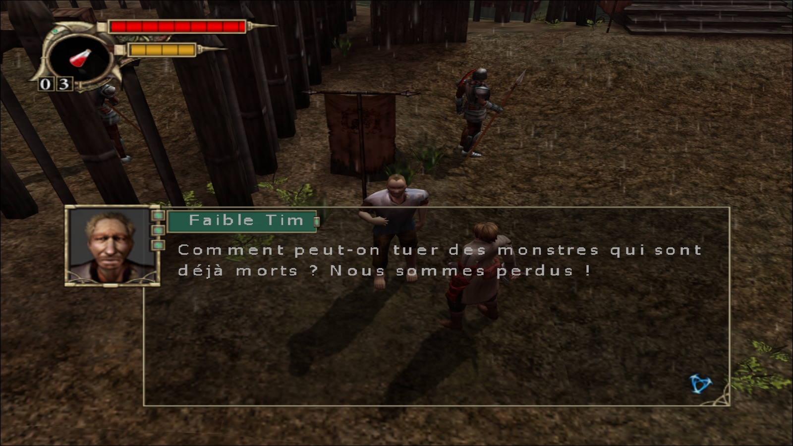Daemon Vector est censé nous présenter un univers de Dark Fantasy, où les morts sont légion et où les scènes de violence et de gore sont nombreuses et sans concession, comme en témoigne l’avertissement en début de jeu : “ATTENTION, le jeu contient des scène explicites de violence et d’horreur”. Un message qui contraste légèrement avec l’adorable mention PEGI 12 sur la jaquette, les instances de classification s’étant probablement bien marrées en voyant les fameuses scènes explicites de violence et d’horreur qui réussissent l’exploit de ne pas mettre à l’écran une seule gerbe de sang, et pas un seul membre amputé, rien. Je suis persuadé que les développeurs voulaient créer un monde à la Berserk (et j’en profite pour m’excuser platement auprès des fans de l’oeuvre de Kentaro Miura pour oser mentionner son nom dans la fiche de cette bouse), mais la mise en scène d’une pauvreté absolue rend chaque tentative de montrer quelque chose de vaguement violent particulièrement risible. Bien évidemment, la mise en scène est accompagnée par des graphismes déjà indignes de la XBOX en 2004 (même la Saturn de SEGA arrivait à sortir quelque chose de plus détaillé), alors imaginez sortir ça sur PC en 2007 ! Mais bon, soyons honnêtes, les graphismes de piètre qualité peuvent être pardonnés si le jeu arrive à proposer un gameplay qui réussisse à tenir les joueurs en haleine.