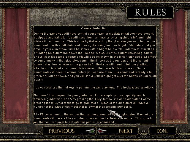 “Bonjour à tous. Je suis monsieur Pilum, votre professeur d’histoire, remplaçant de madame Mordred pour le reste de l’année. Vous vous demandez sûrement pourquoi nous faisons cours dans cette salle aujourd’hui, il s’agit d’une des nouvelles directives de l’éducation nationale : en effet, dans un souci de moderniser nos outils pédagogiques et de s'adapter aux nouvelles pratiques des jeunes, il nous a été demandé d'intégrer le support Jeu Vidéo dans nos cours, d’où notre présence ici, dans cette salle informatique. Sur votre écran, vous trouverez l’icône du jeu The Gladiators of Rome, sorti en 2002 et édité par Activision Value, la branche des jeux à petit budget et petit prix de l’éditeur Activision.”