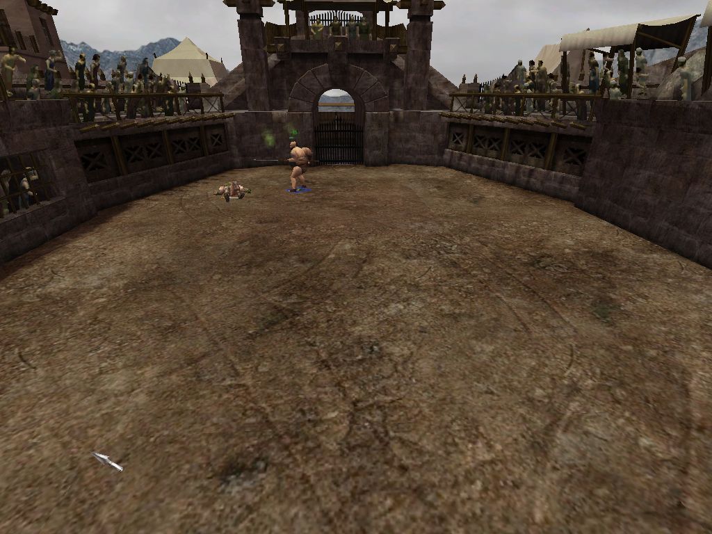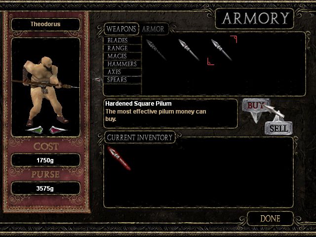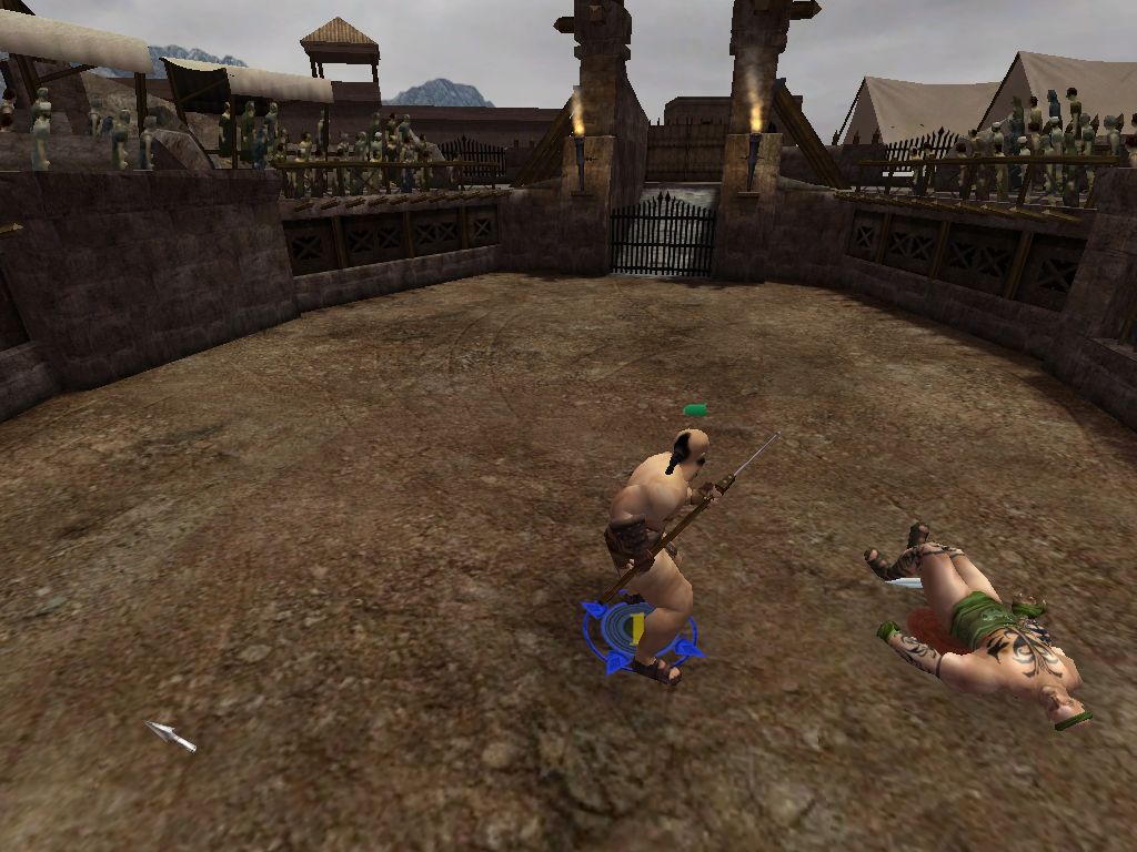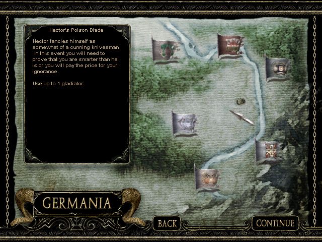 Une fois la phase de combat lancée, le jeu est une sorte de jeu de rôle avec un système de combat mélangeant tour par tour et temps réel, similaire à ce qu’offre l’Active Time Battle des Final Fantasy depuis le sixième opus, mais au lieu de décider de ce que va faire le personnage, chaque action possède son propre temps de recharge. Il va donc falloir utiliser les actions d’esquive, d’attaque, de déplacement ou encore de coup spécial au bon moment pour espérer l’emporter. Et… c’est tout. D’autant plus que niveau mise en scène, c’est le niveau 0, tout juste un peu de sang quand un gladiateur s’écroule, et c’est tout. Et ensuite on recommence, on achète des nouveaux esclaves si nécessaire, on les entraîne, on les équipe, et on passe au niveau suivant. Heureusement que le jeu possède quelques armes différentes, notamment une fronde pour les attaques à distance, mais en dehors de ça, c’est extrêmement pauvre. Et ça, c’est sans parler de l’abominable caméra et de la difficulté de gérer tous ses gladiateurs en même temps une fois qu’on a dépassé le nombre de deux personnages à l’écran.