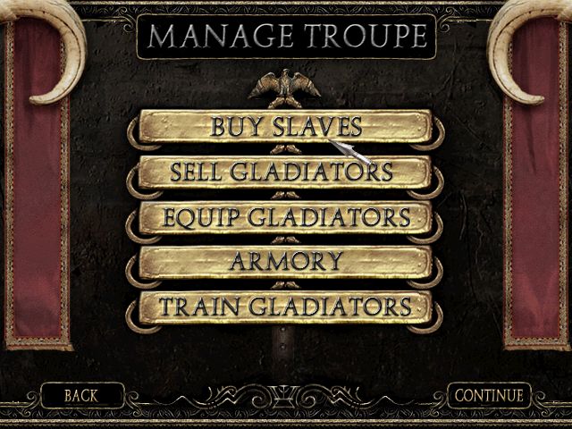 Et bon sang qu’ils avaient raison, ces petits enfants, parce que le spectacle qui s’affichait sur l’écran de monsieur Pilum était fort désolant : musique générique, menus austères… Et l’absence d’un vrai manuel n’aidait pas non plus, bien qu’il ne faille pas aller bien loin pour comprendre le système de jeu, extrêmement simple voire simpliste : en effet, on commence par acheter un ou deux esclaves avec un budget alloué, puis on peut l’entraîner pour augmenter ses statistiques comme la Vie, la Force ou la Vitesse. On peut aussi acheter de meilleures armes à l’armurerie avant d’aller dans l’arène.